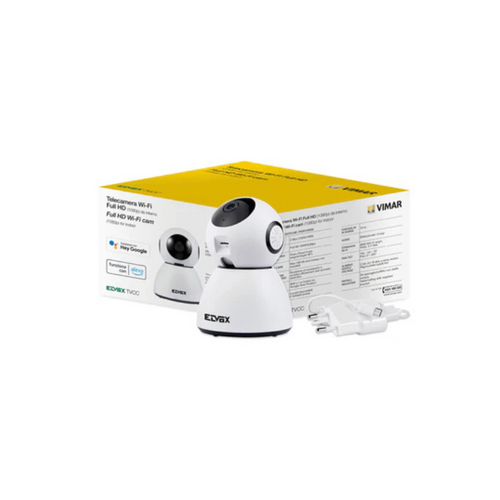 Motorized Day&Night Wi-Fi PT IP camera, Full-HD resolution (2 Megapixel, 1920x1080), 4 mm fixed lens with 96° vision, mechanical IR filter, H264 compression, included 5 Vdc plug-in supply unit, IR 10 m, motion detector functions and notifications sending. View Product app for Android and iOS. SD-Card up to 128 GB (not included), IEEE 802.11 b / g / n 2.4 GHz Wi-Fi standard. Compatible with voice assistants. Dimensions Ø 87 x 123 mm. Weight 185 g