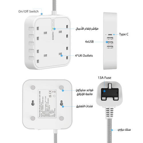 1. Materials: PC, Copper2. Colors:White/Black3. Product weight:432.5 g4. Rated voltage & current: 13A 250V ~ @ 3250W5. Socket: UK6. Cable :1.8m, 1.0m㎡7. SPD:Type 38. Over current protection9. Product size: 122*122*29mm10. USB output:Total 5V 3.4A,Single C port:5V 3A Max,Single A port 2.4A Max11. Maximum Absorbed Energy: 700J 12. VPR: 1100V